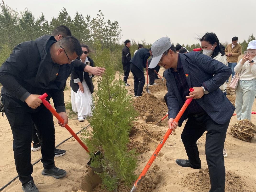 除了丰富的参观学习环节,此次春游还安排了有趣的沙漠植树体验活动。在保护区工作人员的耐心指导下,教职工们纷纷拿起工具,热情高涨地投入到植树活动中。大家分工协作,有的挥锹铲土,有的扶苗培土,有的提水浇灌。尽管沙地松软,增加了劳动难度,但这丝毫没有影响大家的积极性。在大家的共同努力下,一棵棵新树苗在沙地上扎根,为这片土地增添了新的生机。