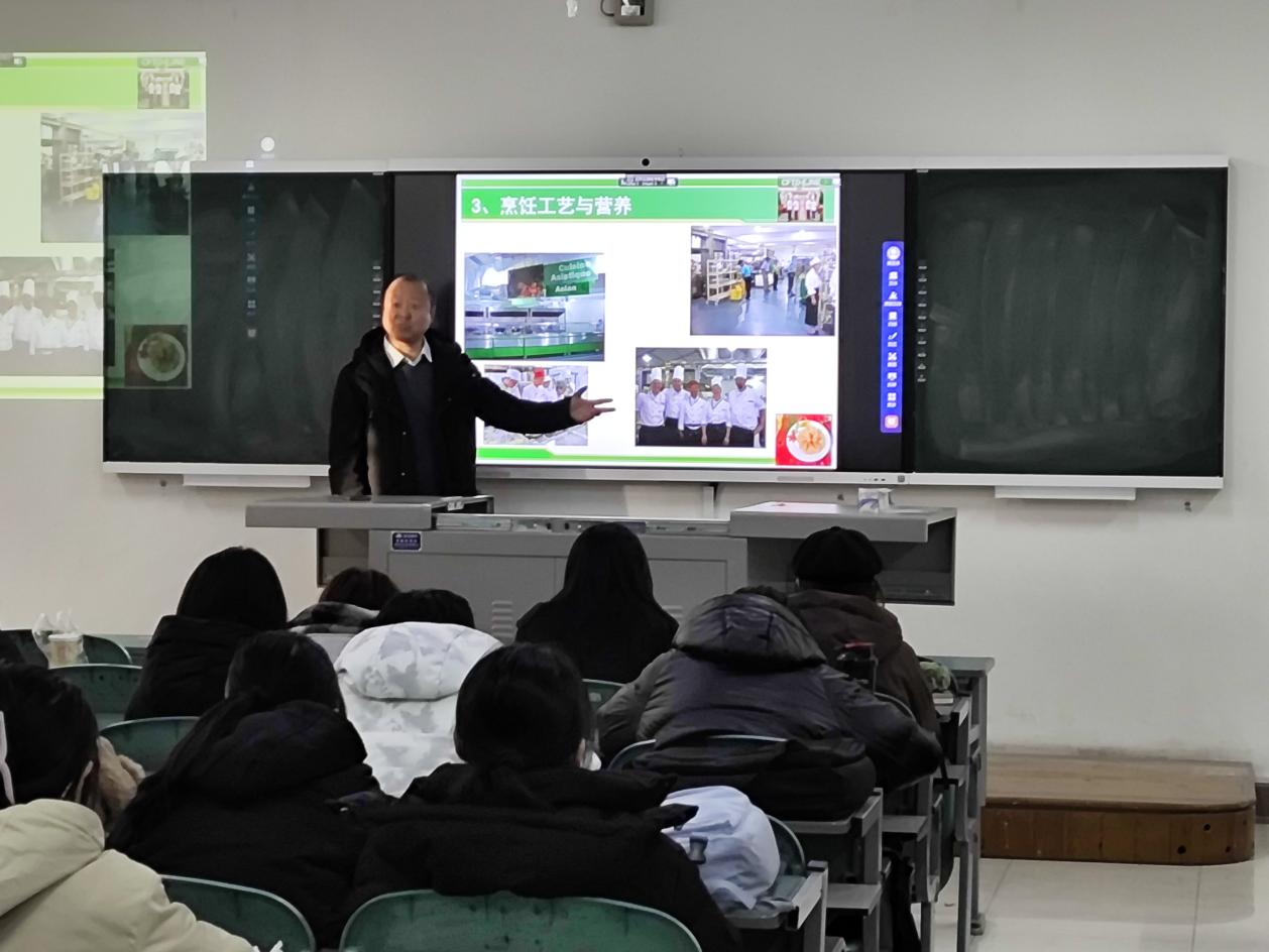 烹饪专业的基本情况。报告中宋国庆老师分享了他自身的成长过程,着重介绍他作为主厨带领团队,参加2008年北京奥运会、2009年世界大学生冬运会、2010年广州亚运会和2012年上海世博会的餐饮服务,以及参加中央二套《厨王争霸》主厨,获得全国烹饪大赛金银的经历。报告中还与同学们分享了宋老师对预制菜加工与发展的理解。
