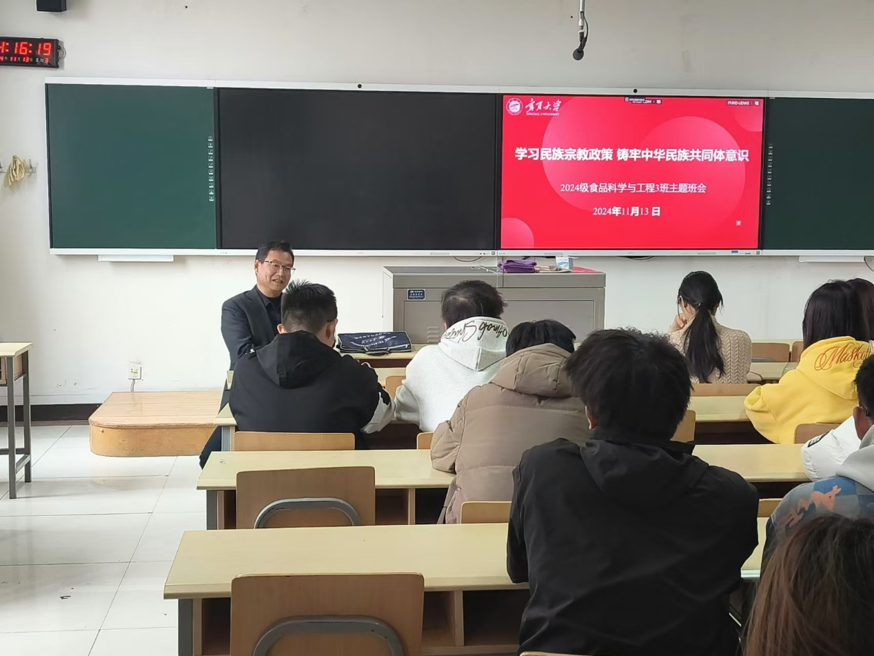 11月13日,三公扑克 2024级食品科学与工程专业3班主题班会在文萃二教303教室召开。此次班会主题为“学习民族宗教政策,铸牢中华民族共同体意识”,会议由班主任雒雪丽老师主持,三公扑克 联系班级领导李文华副书记出席会议并作了宣讲。