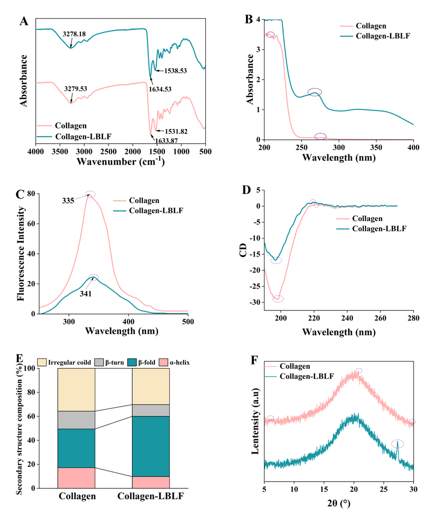 Fig. 1. Structural characterization of collagen and collagen-LBLF complexes. (A) Fourier-transform infrared spectra (FTIR). (B) UV–Visible absorption spectra. (C) Fluorescence spectra. (D) Circular dichroism (CD) spectra. (E) Relative content of collagen secondary structure. (F) X-ray diffraction (XRD) pattern