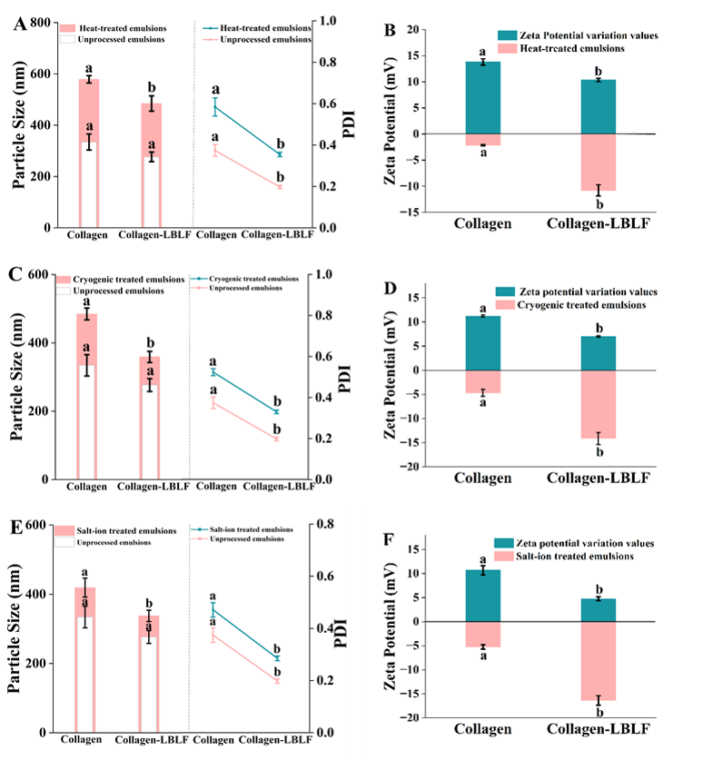 Fig. 5. Effect of physical environmental factors and ionic strength on the stability of emulsions. (A) and (B) Changes in particle size, PDI and zeta potential of emulsions under temperature stress. (C) and (D) Stability of emulsions under low temperature treatment conditions. (E) and (F) Effect of ionic strength on emulsion particle size, PDI and zeta point position. Data with different letters (a-b) in a column are significantly different (P < 0.05).