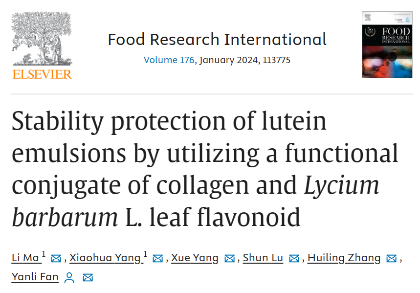 食品营养与健康创新团队范艳丽教授课题组在Food Research International(1区,IF8.1)发表题为“Stability protection of lutein emulsions by utilizing a functional conjugate of collagen andLycium barbarumL. leaf flavonoid”的研究性论文(胶原蛋白和枸杞叶黄酮的功能复合物对叶黄素乳液稳定性的保护作用),该研究受到宁夏回族自治区重点研发项目“枸杞源靶向食源性肠道炎症功能产品研发及产业化示范”(2022BBF02006)资金支持。