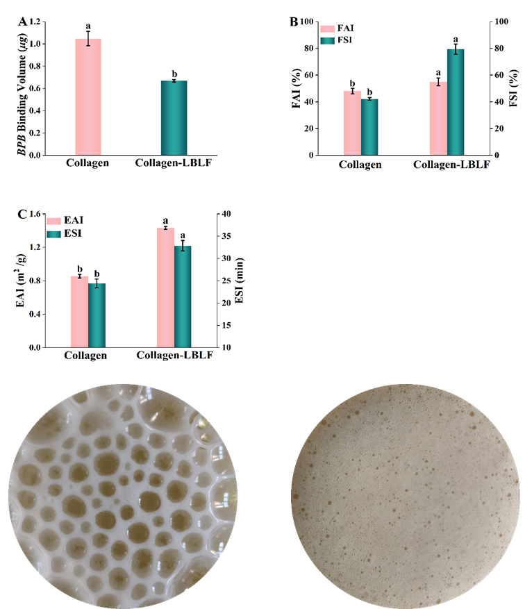 Fig. 3 Changes in the properties of collagen and collagen-LBLF. (A) Comparison of collagen and collagen-LBLF hydrophobicity. The higher the BPB binding volume,the higher the protein hydrophobicity. (B) Comparison of collagen and collagen-LBLF foaming ability and foam stability. Foaming capacity (FAI), foam stability (FSI). (C) Comparison of collagen and collagen-LBLF emulsification capacity and emulsion stability. Emulsification capacity (EAI), emulsion stability (ESI). (D) Collagen foam morphology diagram. (E) Collagen-LBLF foam morphology diagram. The magnification of Fig D and E are 1x. Data with different letters (a-b) in a column are significantly different (P < 0.05).