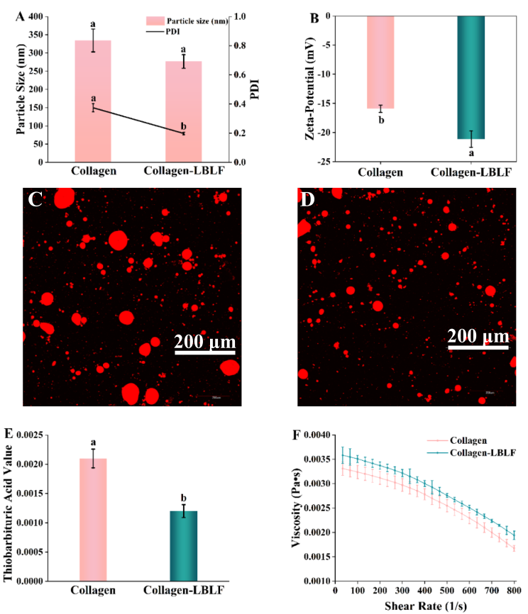 Fig. 4. Characterization of emulsions. (A) and (B) Particle size, PDI and zeta-potential of collagen and collagen-LBLF stabilized lutein emulsion. (C) Confocal laser scanning microscopic (CLSM) image of collagen. (D) Confocal laser scanning microscopic (CLSM) image of collagen-LBLF. (E) Antioxidant capacity of collagen and collagen-LBLF to stabilize emulsions, the higher the thiobarbituric acid value the weaker the antioxidant capacity of the emulsion. (F) Apparent viscosity of collagen and collagen-LBLF stabilizing emulsions. Data with different letters (a-b) in a column are significantly different (P < 0.05).
