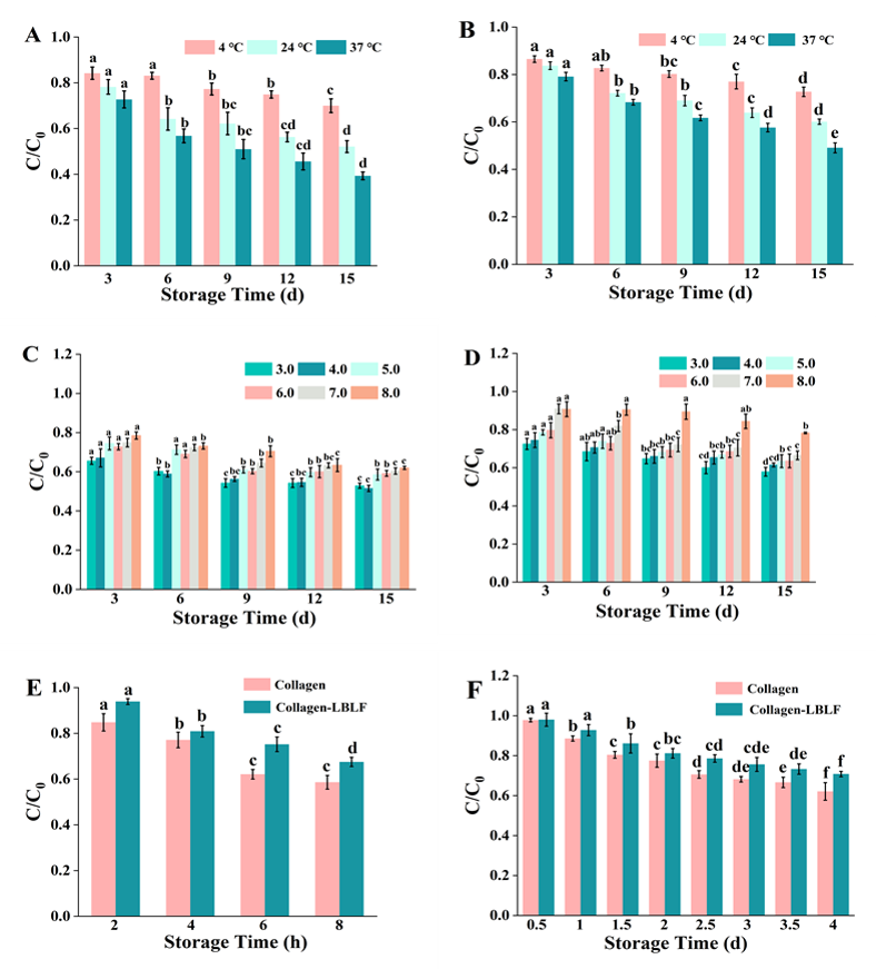 Fig.6. LuteinEmulsion Stability. (A) and (B) Effect of temperature during storage on the stability of lutein emulsions stabilized by collagen and collagen-LBLF. (C) and (D) Effect of pH on the stability of lutein emulsions stabilized by collagen and collagen-LBLF during storage. (E) Stability of lutein emulsions stabilized by collagen and collagen-LBLF under light conditions. (F) Emulsion stability under gastrointestinal simulation. Data with different letters (a-b) in a column are significantly different (P < 0.05).