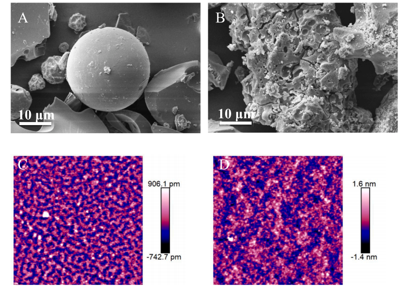 Fig. 2. Apparent morphology of collagen and collagen-LBLF complexes. (A) and (B) Scanning electron microscopy (SEM) of collagen and collagen-LBLF, Magnification of 1000 times (Mag = 1.0 KX). (C) and (D) Atomic force microscopy (AFM) of collagen and collagen-LBLF