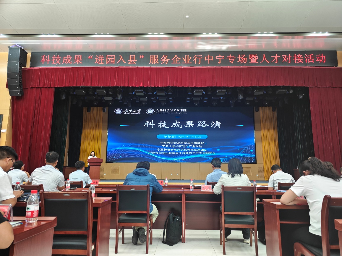 范艳丽教授等代表出席,并在科技成果路演环节重点发布三项枸杞领域核心科研成果。其一为“逆流切向模式超声强化枸杞制浆提质增效关键技术与应用”,可显著提升枸杞制浆效率与品质;其二是“宁夏枸杞冷鲜物流关键技术与应用”,为解决枸杞运输保鲜难题提供技术方案;其三为“高活性冻干枸杞益生菌粉的开发与应用”,拓展了枸杞深加工产品品类。三项成果均紧密贴合中宁枸杞产业实际需求,得到现场企业高度关注。