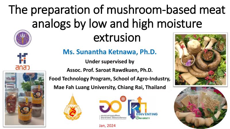 Sunantha博士介绍了欧美和东南亚部分国家植物基肉制品的市场情况,对普通大豆蛋白所制造的蘑菇基香肠的加工特性等方面的研究结果做了分享,并表示杏鲍菇和大豆蛋白可以用作一种新的替代蛋白质来源,在香肠中可替代高达40%肉类的潜力。在素食性蛋白食品的开发、食用菌类高值化的应用和肉制品替代等方面具有深远的意义和广泛的研究价值。