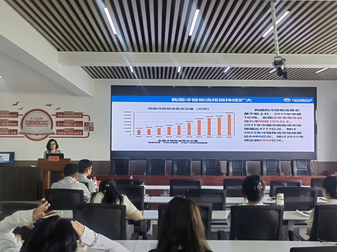 报告中,谢教授围绕冷链物流的战略意义、发展现状及面临挑战进行了系统讲解。她指出,冷链物流是保障食品安全、减少农产品损耗、助力乡村振兴的重要支撑。近年来,我国冷链产业快速发展,市场规模不断扩大,技术水平持续提升。针对冷链行业面临的能耗高、标准不统一、食品安全风险等问题,谢教授提出了加强节能技术应用、优化全程温控体系、推动标准化和智能化建设等应对策略,并结合典型案例介绍了冷链在提升农产品附加值中的关键作用。报告最后,谢教授强调,冷链行业发展应加强科技创新与政策协同,推动全链条高质量升级。现场气氛热烈,师生们围绕冷链设备升级、食品安全监控等问题展开积极交流。
