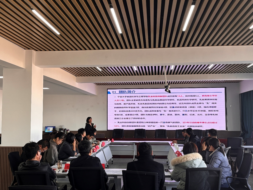 乳业科技创新团队剧柠老师详细介绍了团队的成员构成、研究方向及科研成果。团队现有成员 14 人,其中教授6人,博士学历人员12名。近五年,团队在乳制品基础科学研究、乳品风味科学研究、乳酸菌菌种挖掘与利用等方面取得了丰硕成果,主持多项国家和自治区级科研项目,发表高水平论文 40 余篇,授权发明专利 5 项,成果登记 4 项,并与区内多家乳制品企业建立了良好合作关系。