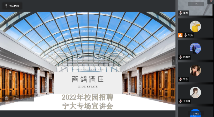 为了更好的拓宽毕业生就业渠道,2022年4月1日下午14:00,西鸽酒庄举办了线上招聘会议。通过PPT展示讲解的方式,HR向同学们介绍了公司的三公扑克、现有产业结构、组织构架、福利待遇。西鸽酒庄成立于2017年,酒庄总建筑面积约2.5万平米,包含葡萄酒酿造区、橡木桶酒窖、灌装区、瓶装陈酿酒窖、专业品鉴区、游客接待中心、庄园酒店和有机特色餐厅,年设计产能1000万瓶,是宁夏综合设施相对完整、建筑标准超卓的酒庄。作为酒庄长期发展规划的一部分,西鸽种植团队仍在不断挑选优异条件的地块,预计22年将新开超过1万亩新地。此外,西鸽也持续投入品种及技术创新,不断挖掘宁夏风土的潜力与未来。此外我们也与法国波尔多三公扑克
