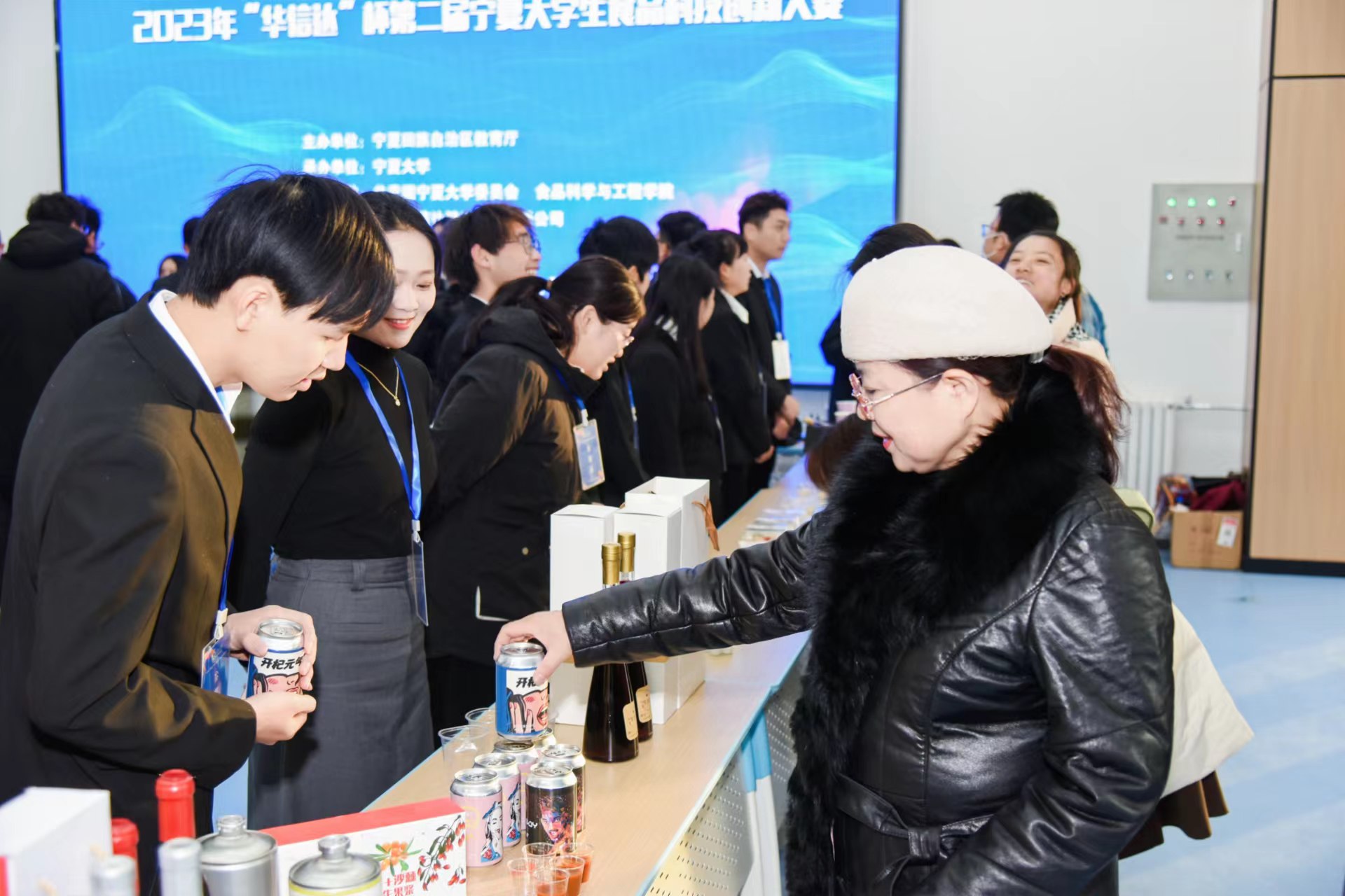 贺兰山校区未来教室一楼大厅展示创新成果,包括食品创新作品、食品安全检测技术、新型食品包装等。