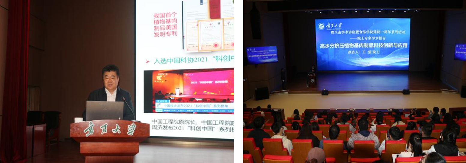 王强院士的报告题目是:《高水分挤压植物基肉制品科技创新与应用》。王院士主要针对高水分挤压植物基肉制品存在的植物蛋白原料挤压特性不清、纤维结构形成机理不明、关键核心工艺装备落后等瓶颈问题,围绕植物蛋白原料挤压适宜性评价、蛋白质纤维结构形成与调控机制、高水分挤压关键技术与核心装备创制、营养健康植物基肉制品系列产品开发等内容,系统阐述高水分挤压新型植物基肉制品的最新研究进展。