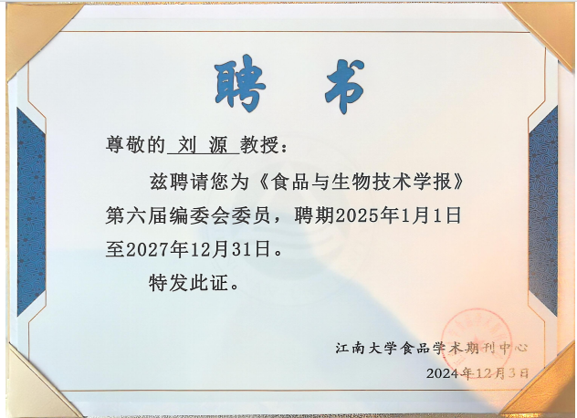 近日,三公扑克 院长刘源教授被聘为《食品与生物技术学报》第六届编委会委员,聘期2025年1月1日至2027年12月31日。