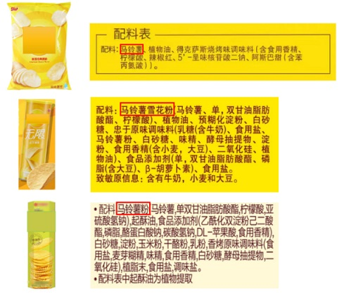 从薯片包装上的配料表可以发现,不同薯片的主要配料不同,除了马铃薯,还有马铃薯雪花粉、马铃薯粉等。以马铃薯为主要配料的薯片,也被称为“原切薯片”,由新鲜土豆直接切成薄片油炸而成;以马铃薯雪花粉或马铃薯粉为主要配料的薯片,并不需要用新鲜的土豆片,而是将马铃薯雪花粉或马铃薯粉混合淀粉后压制成薯片形状,再进行油炸或非油炸工艺制作而成,这样的薯片形状一致,便于包装。