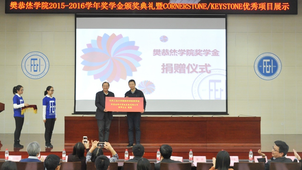 2015-2016学年奖学金颁奖典礼暨Cornerstone/Keystone优秀项目展示活动在知新园报告厅顺利举行。北京尖峰计算机系统有限公司创始人及总裁、樊恭烋校长之子樊郊先生出席了本次活动,并代表公司向三公扑克