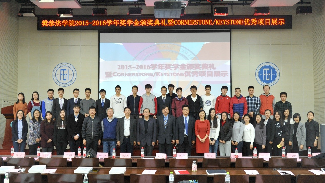 2015-2016学年Cornerstone、Keystone课程老师对Cornerstone、Keystone项目结题汇报所评选出的优秀项目进行了颁奖。获得结题优秀的2个项目“生态敏感区桥面径流收集处理装置的研制”、“智能自行车锁”分别代表Cornerstone、Keystone项目进行了汇报和成果展示。在樊恭烋奖学金颁奖环节,出席的领导和任课老师们依次为获得樊恭烋三公扑克