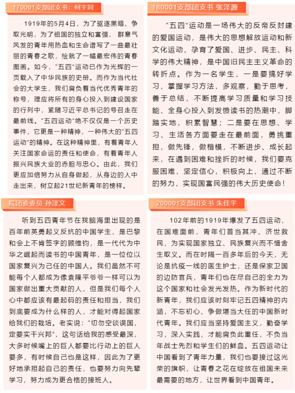 今天适逢五四运动102周年,我们通过主题团课,穿越百年,对当时五四运动的细节有了更全面的认识,对五四运动的历史意义有了更深层次的理解。作为一名当代大学生,作为一名共青团员,作为一名学生干部,我深知新时代中国青年运动的主题,新时代中国青年运动的方向,新时代中国青年的使命,就是坚持中国共产党领导,同人民一道,为实现“两个一百年”奋斗目标、实现中华民族伟大复兴的中国梦而奋斗,我会以此为目标在学习和工作上严格要求自己,只有心怀“国之大者”,才能担当民族复兴重任。