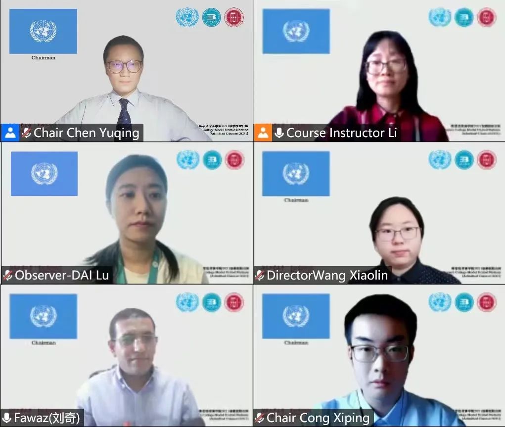 2021级全体同学参加了这次大会。大会邀请了外教Dr.Fawaz作为评审专家,综合办公室主任戴璐老师列席,陈宇卿、丛煕平和王晓林三位高年级学长学姐作为主席团成员联席主持了本次模拟联合国大会。