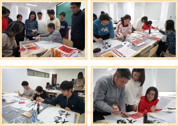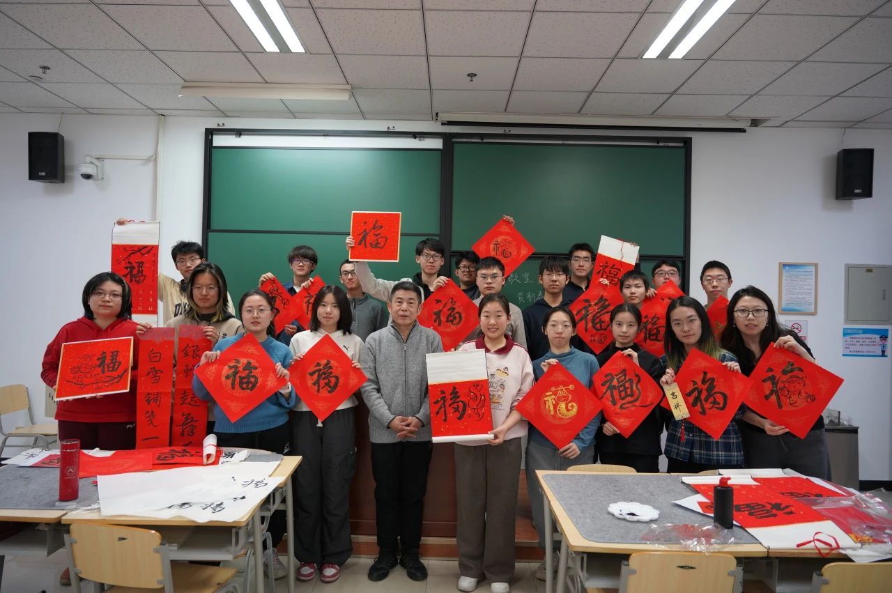 在讲解环节过后,实践环节将活动气氛推向高潮。首先,范教授给大家进行书法示范。凭借范教授对中国传统文化的深刻理解与深厚的功底,不过寥寥数笔,一个又一个形态各异而龙飞凤舞的福字跃然纸上。范教授幽默风趣的讲解引得现场笑声不断,轻松活跃的氛围让同学们在愉快中汲取了知识。随后,在范教授的指导下,同学们拿起毛笔,铺开宣纸,开始书写象征新春喜庆的“福”字与春联。第一次握笔的同学显得小心翼翼,而有书法基础的同学则落笔流畅,各显身手。伴随着笔尖与纸张的轻触,祝福与美好在墨香中缓缓流淌。