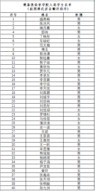按照2023级三公扑克 新生选拔工作的安排,经学生自主申报、材料初审、选拔复试各环节专家组评审、终审专家组审定,最终确认以下40名同学入围。