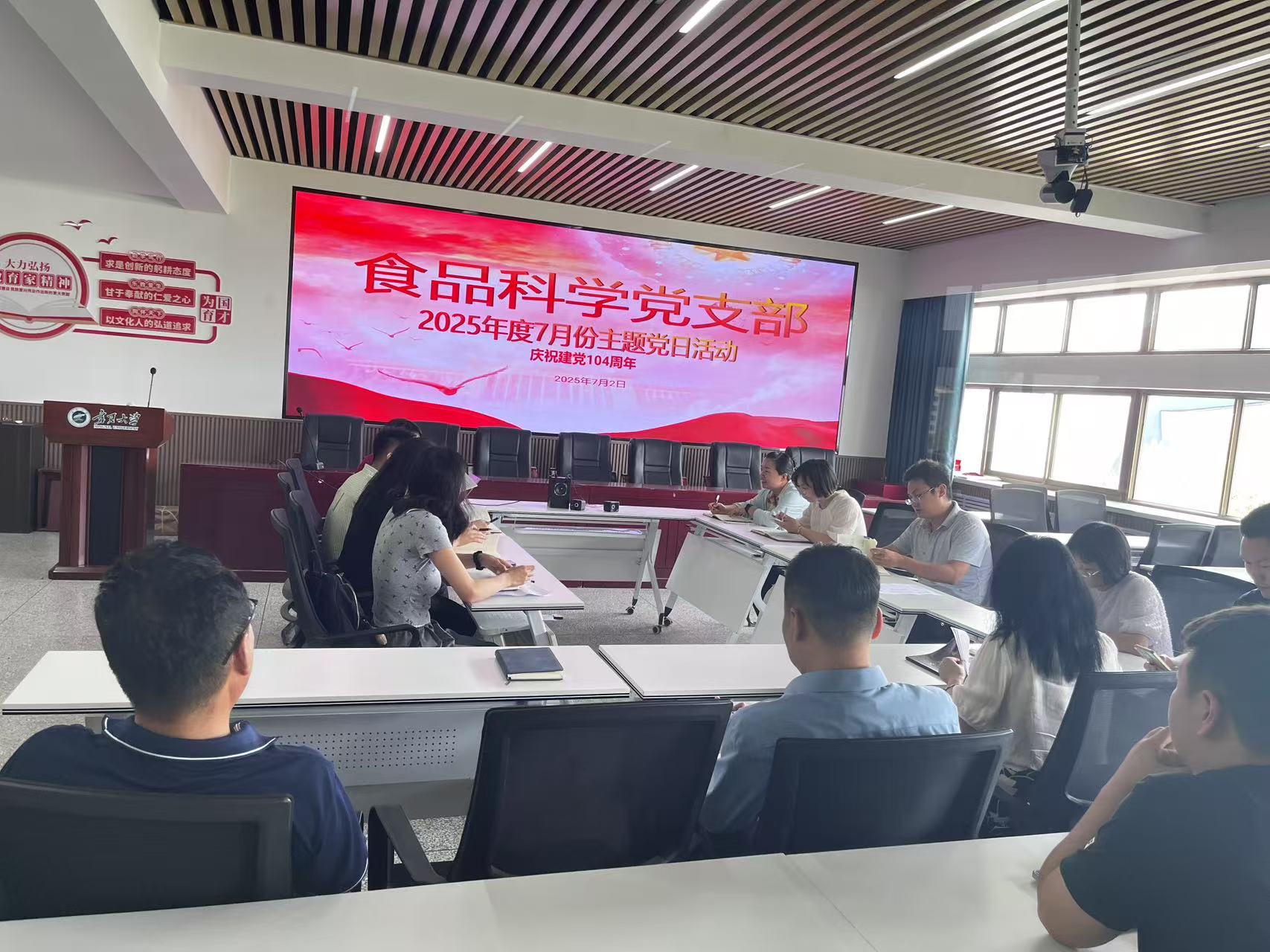 2025年7月2日下午,食品科学党支部组织召开7月份主题党日活动,隆重庆祝中国共产党成立104周年。通过专题党课、理论学习、警示教育等多种形式,进一步坚定理想信念,强化使命担当。